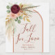 Elevate your autumn celebration with this elegant wine bottle label from the Fall in Love collection. Featuring a hand-painted watercolor bouquet of deep burgundy mums, soft blush pink roses, golden fall leaves, dried pampas grass, sage eucalyptus greenery, and rustic pheasant feathers, this design exudes a warm, romantic charm. A boho chic terracotta rust orange arch frames the artwork, adding a sophisticated western inspired touch. Perfect for autumn wedding receptions, fall bridal showers, engagement parties, rehearsal dinners, or rustic vineyard events, this label instantly dresses up your favourite bottles. Pair it with coordinating invitations, place cards, menus, and gift tags from the Fall in Love Event Suite for a cohesive, upscale seasonal look.