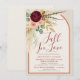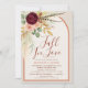 Celebrate the bride to be with this Fall in Love bridal shower invitation, featuring an elegant fall watercolor floral bouquet of burgundy red chrysanthemum blooms, blush pink roses, eucalyptus greenery, pheasant feathers, dried pampas grass foliage, golden autumn leaves and more. The design is framed by a graceful yet modern arch in warm terracotta rust orange and soft oatmeal beige for a natural, earthy feel. With its modern rustic boho style, this invitation sets the perfect tone for an autumn celebration. Pair with coordinating signs, thank you cards, games, favours, and décor from the Fall in Love event suite for a beautifully cohesive bridal shower this fall.