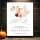 This wedding welcome sign (poster) features a watercolor yellow pumpkins adorned with burgundy, maroon, and burnt orange flowers over fall leaves. For more advanced customization of this design, Please click the "Customize further" link.