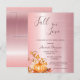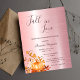 On front: A modern, elegant and simple Bridal Shower invitation for fall. A faux rose gold metallic foil background. Decorated with a golden pumpkin, foliage and som white flowers. Templates for the bride to be's name, date and place of the shower. The text: Fall in Love is written with a large hand lettered style script, dark rose gold coloured letters.