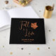 Fall In Love maple leaf rustic wedding theme keepsake Guest Book. Elegant and simple copper, brown, with black background dinner reception supplies. Beautiful country autumn themed design. Image copyright Marg Seregelyi Photography.