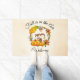 A welcome door mat with a typography design which says Fall is in the air. Illustrated with an adorable squirrel standing behind some orange watercolor pumpkins. A decorated foliage wreath surrounds them with an oak leaf, an acorn, autumn orange flowers and other sprigs and leaves. Background is a vintage looking off-white with aged light brown edges.