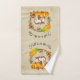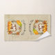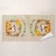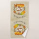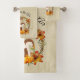 A bath towel set with a typography design which says Fall is in the air. Illustrated with an adorable squirrel standing behind some orange watercolor pumpkins. A decorated foliage wreath surrounds them with an oak leaf, an acorn, autumn orange flowers and other sprigs and leaves.  Background is a light brown vintage grunge texture/image.