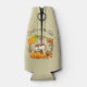 Bottle cooler with a typography design which says Fall is in the air. Illustrated with an adorable squirrel standing behind some orange watercolor pumpkins. A decorated foliage wreath surrounds them with an oak leaf, an acorn, autumn orange flowers and other sprigs and leaves.