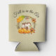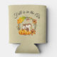 Can cooler with a typography design which says Fall is in the air. Illustrated with an adorable squirrel standing behind some orange watercolor pumpkins. A decorated foliage wreath surrounds them with an oak leaf, an acorn, autumn orange flowers and other sprigs and leaves.