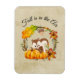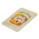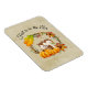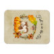 A flex magnet with a typography design which says Fall is in the air. Illustrated with an adorable squirrel standing behind some orange watercolor pumpkins. A decorated foliage wreath surrounds them with an oak leaf, an acorn, autumn orange flowers and other sprigs and leaves. The background is a light brown vintage grunge image/texture.