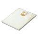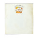 A notepad with a typography design which says Fall is in the air. Illustrated with an adorable squirrel standing behind some orange watercolor pumpkins. A decorated foliage wreath surrounds them with an oak leaf, an acorn, autumn orange flowers and other sprigs and leaves. Background colour is a vintage looking off-white with aged light brown edges.
