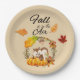 Typography design which says Fall is in the air. Illustrated with an adorable squirrel standing behind some orange watercolor pumpkins. A decorated foliage wreath surrounds them with an oak leaf, an acorn, autumn orange flowers and other sprigs and leaves.