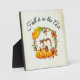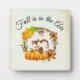 A photo plaque with a typography design which says Fall is in the air. Illustrated with an adorable squirrel standing behind some orange watercolor pumpkins. A decorated foliage wreath surrounds them with an oak leaf, an acorn, autumn orange flowers and other sprigs and leaves. Background is a vintage looking off-white with aged light brown edges.