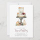 This sweet and charming invitation for fall or autumn season birthday parties features a watercolor illustration of an elaborate tiered cake decorated with pumpkins, greenery, and burgundy flowers, with your party details beneath in soft grey and burgundy lettering.