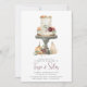 This sweet and charming invitation for fall or autumn season engagement parties features a watercolor illustration of an elaborate tiered cake decorated with pumpkins, greenery, and burgundy flowers, with your party details beneath in soft gray and burgundy lettering.