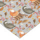 Autumn woodlands themed tablecloth pattern features fox and badger with leaves and acorns on light grey background.