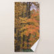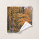 Pretty falll leaves in red orange and golden yellow in a forest of tall tulip poplar trees and green shrubs. Blue sky peeking through. Happy Autumn, Nature's Beauty., Fall leaves is written in yellow and orange script. Original Photography © TamiraZDesigns.