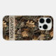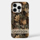 Customize this fall leaves camouflage iPhone 16 pro case with your name in a trendy modern CAP font in brown on opaque cream. It's masculine and perfect for your favorite military, hunting, country or outdoorsman!