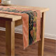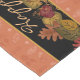Stylish Fall colours cloth table runner done in graphics of colourful autumn leaves against a black background. An orange on orange leaf pattern band, runs down both sides of the black middle, of the runner. Golden tan text, across the middle of the runner, reads Happiness, Love, Thanks, and Family, and can be personalized to read what you want. Lovely table accent for the Fall and Thanksgiving.