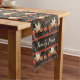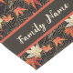 Customize this elegant table runner with a pattern of red and white fall maple leaves on a black background with your family name.