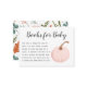 Cute pumpkin theme baby shower books for baby card featuring illustration of a pink pumpkin with fall botanicals. This card asks guests to bring books instead of a card. Send this with the invitation card. Great for a girl's shower in autumn.