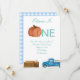 1st birthday pumpkin invitation with blue truck and blue plaid design, easy to edit text.