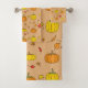 Cute Fall pumpkins pattern with Autumn leaves. Thanksgiving seasonal colours and elements.