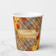These customizable paper cups feature a beautiful, harvest-inspired design, perfect for your autumn gathering. The backdrop is a cozy, warm plaid pattern—a lattice of browns, tans, and taupes—evoking a comforting, flannel feel. A lush border of vibrant fall foliage frames the center, with deep crimson and fiery orange maple leaves intermingling with cheerful mini-pumpkins and gourds. A rustic, gilded brushstroke boldly displays "HAPPY THANKSGIVING" in a textured font, with space for a personalized family name or custom message. This design is an instant elevation to your holiday table, offering a sophisticated yet welcoming tone.