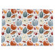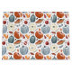 This design features a beautiful autumn-themed pattern with a focus on pumpkins and other fall harvest elements. The design includes various pumpkins in shades of orange, cream, and muted blue, each detailed with subtle watercolor textures. Complementing the pumpkins are elements like corn on the cob, autumn leaves in warm earthy tones, berries, and slices of pumpkin pie. The pattern is set against a crisp white background, allowing the rich colours and detailed illustrations to stand out. This design captures the essence of the fall season, evoking feelings of warmth, harvest, and festive celebration.