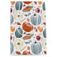 This design features a beautiful autumn-themed pattern with a focus on pumpkins and other fall harvest elements. The design includes various pumpkins in shades of orange, cream, and muted blue, each detailed with subtle watercolor textures. Complementing the pumpkins are elements like corn on the cob, autumn leaves in warm earthy tones, berries, and slices of pumpkin pie. The pattern is set against a crisp white background, allowing the rich colours and detailed illustrations to stand out. This design captures the essence of the fall season, evoking feelings of warmth, harvest, and festive celebration.