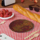 Autumn rustic red gold neon dark elegant maple leaves fall themed wedding. Fall round paper plates. Image copyright Marg Seregelyi Photography.