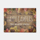 Fun fall season, rustic wood outdoor decor for rvers, retired couples, hikers, campers, and nature lovers- Personalized, wooden boards look doormat reads 'Happy Campers' with a template below for adding family name or any custom text in white, handwritten looking letters. Rustic autumn theme border of watercolor pumpkins, sunflowers, leaves and wildflowers in fall colours against a background of rustic, old barn wood boards. Great retirement gift, too. Would be right at home in front of an RV or cozy log cabin for the fall. Cute Thanksgiving welcome mat, too.