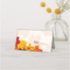 Fall leaves wedding seating cards with brightly coloured foliage. Use this tented card as either an escort card with table number, or remove that text and buy blank to use as place cards. Red, yellow and orange maple leaves make a pretty border on the front. More leaves create a background on both sides of standing cards. Each pack contains 25 cards. Names can’t be pre-printed as they come in bulk.
