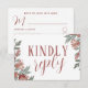Make it easy for your guests to reply in style with this unique modern RSVP card, beautifully adorned with rustic botanical foliage in warm terracotta and soft sage green tones. The design features original watercolor illustrations that evoke a natural, romantic aesthetic—perfect for boho, rustic, outdoor, or autumn weddings. Set against a clean white background, the card includes elegant, easy-to-read typography and is fully customizable to suit your wedding details. Whether you're planning a garden ceremony, woodland event, or a modern countryside celebration, this RSVP pairs effortlessly with coordinating wedding stationery from the same collection..