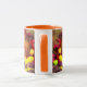A mug with my design of a pumpkin sitting in the middle of fall garden favourites such as squash, apples, grapes, apples and oranges, with autumn leaves and pine-cones.