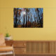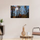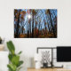 This poster features the sun shining through tall autumn trees. Colourful leaves, blue sky.