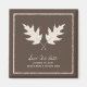A fall wedding save the date magnet featuring an off white image of oak leaf rubbings crossed with matching text and border. Dark brown background.