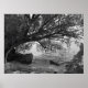 This black and white seascape photogrpah features a tree overhanging the water along the shore at Lake Erie. The rocky coast with boulders of different sizes lines the waters edge. The leaves have a feathery appearance as the tree trunk, branches and leaves, lying horizontal, overhangs the water. This scenic landscape photograph was taken along the coast of Lake Erie, Ohio.