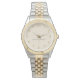 This women's watch is shown in the two tone silver and gold colours and features a petite Gold coloured crown at 12:00, a sheer Beige face with Golden time markings and has text of "Families Are Forever"