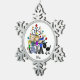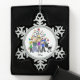 Un joli ornement en forme de flocon de neige comprend une famille de figurines en bâton, dont un père, une mère aux cheveux blonds, un garçon en casquette de baseball, et une petite fille avec un sac à dos, et un chien de famille noir devant un arbre de Noël décoré. Vous pouvez facilement ajouter la date de l'année courante.