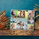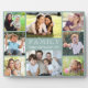An elegant custom sage green plaque to display your favourite family pictures featuring an 8 photo collage of parents, children, grandparents, other family members, pets, etc., "FAMILY" in elegant white typography, and your family names or other text in simple white typography.