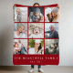 This keepsake fleece blanket features a collage of nine of your favourite square family photos on a cranberry red background Add your family's name and establishment date or other text at the bottom in white serif font.