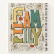 This image features a vintage-inspired typographic design of the word "FAMILY." The letters are stylized with a retro, hand-drawn feel, using a colour palette of warm and earthy tones. The design incorporates decorative elements like hearts, houses, and swirling flourishes, adding a whimsical touch. The overall aesthetic is nostalgic and evokes a sense of warmth and togetherness.
