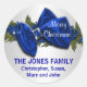 A beautiful round shaped sticker with a cobalt and navy blue FAUX satin ribbon resting on a Xmas wreath filled with snow berries and green leaves that has the words, Merry Christmas, and a template for your families name, which pop against a vibrant silver grey background. IDEAL FOR - Decorating your paper products and presents this Xmas season.