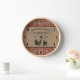 A beautiful, rustic themed wall clock with your family name and "farmhouse", ranch, homestead or other desired text and an established date. This unique, custom design features hand drawn artwork of a rooster, hen and chicks on a burlap style backing and surrounded with beautiful vintage country plaid in soft shades of red. A charming addition to your vacation home decor. Feel free to visit my designer store to see more items and designs like this. Thanks.