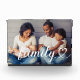 A beautiful horizontal acrylic photo block featuring "Family" in flowing white calligraphy script with a heart flourish, layered over a single custom photo. The elegant script overlay transforms a favorite family photo into a stylish keepsake. The photo is fully customizable. Printed on 1-inch thick Grade A acrylic, this photo block stands freely on any surface — a gorgeous gift for a loved one or a treasured addition to your own home decor.