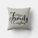 Pillow with quote in black cursive writing "Family is Everything" on grayish tan textured background. Design by Farmhouse Living. Size and fabric options are available and additional home decor products with this design.
