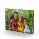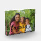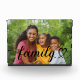 Modern and stylish custom horizontal tabletop photo block features a favourite photo with a minimal "family" typography overlay design that includes elegant flourish and cute heart details. The black text colour can be modified.