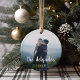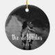 Simple and elegant holiday ornament features a photo on each side with your family name or custom caption overlaid in white calligraphy brush script lettering. Personalized with the year beneath.