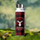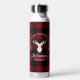 The product design features a silhouette of a deer on a classic red and black buffalo plaid pattern. Combined with your own personalized text, this composition makes a rustic, modern, and unique water bottle - Gift idea for Thanksgiving, Christmas, family reunion, or any other special gatherings!