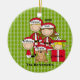 This will be a keepsake of all times! It's an adorable family dressed in red Santa outfits and hats. It has a light green background with darker green dots in a row. There's a Dad, Mom, a girl and a baby boy. There's also a cute dog. Check out the other family combinations and ornaments in our store. ©JW Illustrations
