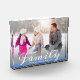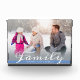 This photo block offers a stylish design featuring a horizontal photo frame that fills the entire front of the block. The word "family" appears in trendy script text across the bottom of the photo. A small blue line offers custom text for family names.