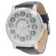 This watch features circles in place of numbers. Each circle is set up as a template to be changed with a photo of your own. Place twelve photos on this watch. The background of the watch is a tree slice. Change the text in the centre of the watch to your own family name.