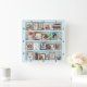 You won't find a more unique and beautiful way to display your family or wedding memories than this beach-themed photo collage design. This gorgeous, nautical artwork includes 15 of your personalized pictures, made to look like they're sitting in frames on a light teal-blue wooden bookcase. Your photos are surrounded by vintage books, a clock, and souvenirs from the seaside, including: shells, flowers, coral, a seagull, a model ship, a starfish, a fish, and an anchor. Your monogram sits on the middle shelf. The colours are mostly teal blue, navy blue, cream, and light coral pink with hints of faux brass, gold, brown, green, and red. TO PERSONALIZE: Use the simple templates. Just follow the instructions and your photos will fill the frames. Tip: Any photo shape will fill each frame (so if you upload a square in the place of a vertical, it will still fill the frame, but some will be cut off). For help, contact PictureCollage.